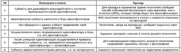 В нашем примере служба собственной безопасности выбирает идентификатор посетителя, вносит его в список и тем самым определяет его права доступа, разрешая проход в определённые помещения и строго отведённое время, а так же разрешает или запрещает тот или иной метод аутентификации: проход только по предъявлению паспорта, проход с паспортом или водительским удостоверением либо проход с любым документом с фотографией.