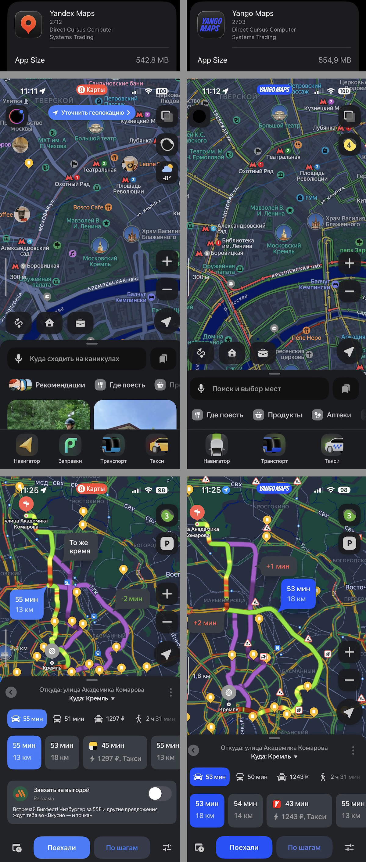 Из других отличий - нет некоторых фишек Яндекс Карт: не показывается время переключения ближайшего светофора, нет интеграции с сервисом оплаты автозаправок из приложения и нет возможности сразу вызвать такси - переадресация идёт на зарубежную же версию такси Yango.